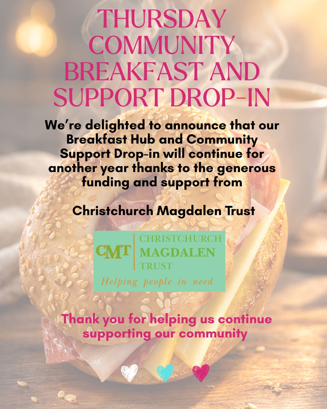 We’re delighted to announce that our Breakfast Hub and Community Support Drop-in will continue for another year thanks to the generous support and funding of £6901.47 from Christchurch Magdalen Trust